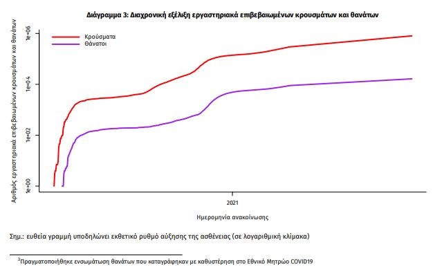 Η διαχρονική εξέλιξη των συνολικών κρουσμάτων και συνολικού αριθμού των θανάτων ασθενών COVID-19 παρουσιάζεται στο ακόλουθο διάγραμμα.