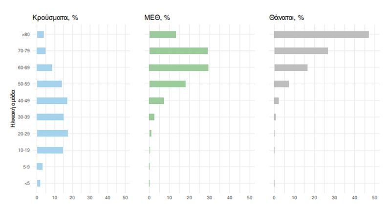 Οι εισαγωγές νέων ασθενών Covid-19 στα νοσοκομεία της επικράτειας είναι 405 (ημερήσια μεταβολή -6.03%). Ο μέσος όρος εισαγωγών του επταημέρου είναι 402 ασθενείς. Η διάμεση ηλικία των κρουσμάτων είναι 38 έτη (εύρος 0.2 έως 106 έτη), ενώ η διάμεση ηλικία των θανόντων είναι 78 έτη (εύρος 0.2 έως 106 έτη)