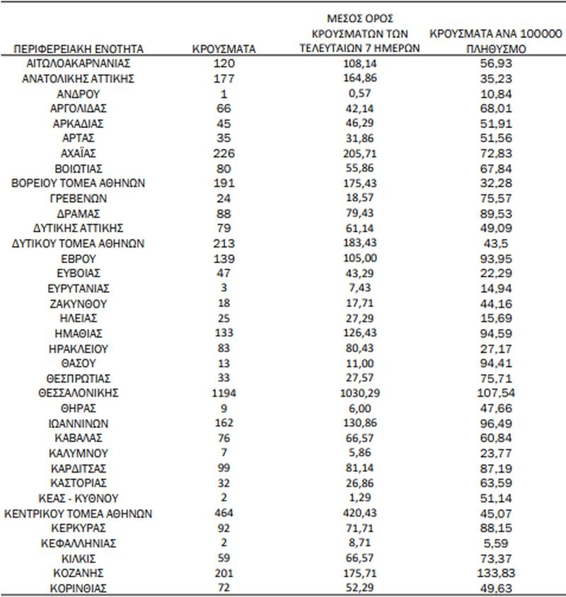 Η κατανομή των 6.848 νέων εγχώριων κρουσμάτων ανά Περιφερειακή Ενότητα παρουσιάζεται στον κατωτέρω πίνακα: