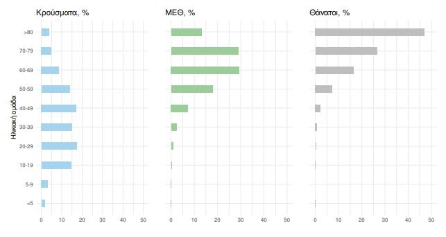 Ακολούθως παρουσιάζεται η ηλικιακή κατανομή των (α) συνολικών κρουσμάτων, (β) των περιστατικών που κατέληξαν σε θάνατο και (γ) των ασθενών που νοσηλεύονται διασωληνωμένοι: