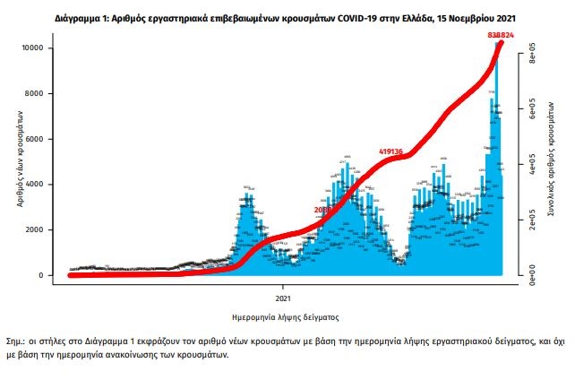 Κορονοϊός - Όλες οι ειδήσεις: Τη Δευτέρα 15 Νοεμβρίου 2021, ο ΕΟΔΥ ανακοίνωσε, 6.950 νέα κρούσματα του νέου ιού στη χώρα, εκ των οποίων τα 15 εντοπίστηκαν σε ελέγχους στις πύλες εισόδου της χώρας.