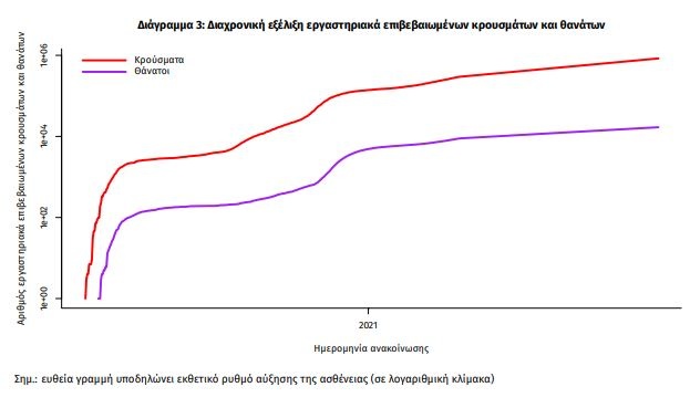 Η διαχρονική εξέλιξη των συνολικών κρουσμάτων και συνολικού αριθμού των θανάτων ασθενών COVID-19 παρουσιάζεται στο ακόλουθο διάγραμμα.