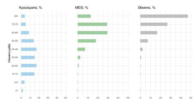 Ακολούθως παρουσιάζεται η ηλικιακή κατανομή των (α) συνολικών κρουσμάτων, (β) των περιστατικών που κατέληξαν σε θάνατο και (γ) των ασθενών που νοσηλεύονται διασωληνωμένοι: