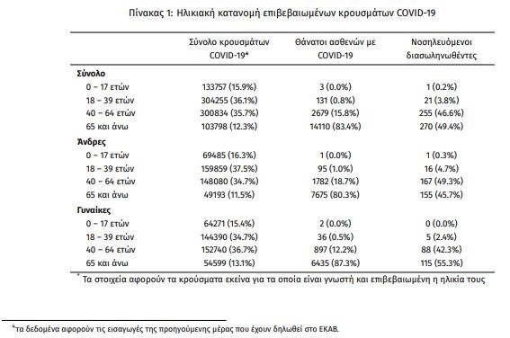Οι νέοι θάνατοι ασθενών με COVID-19 είναι 80, ενώ από την έναρξη της επιδημίας έχουν καταγραφεί συνολικά 16.923 θάνατοι. Το 95.3% είχε υποκείμενο νόσημα ή/και ηλικία 70 ετών και άνω.