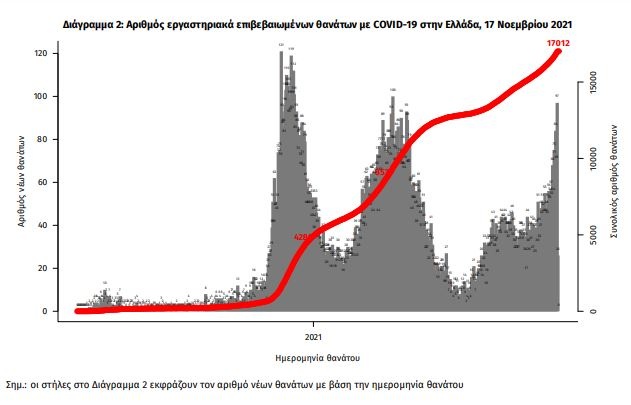 Οι νέοι θάνατοι ασθενών με COVID-19 είναι 87, ενώ από την έναρξη της επιδημίας έχουν καταγραφεί συνολικά 17.012 θάνατοι. Το 95.3% είχε υποκείμενο νόσημα ή/και ηλικία 70 ετών και άνω.