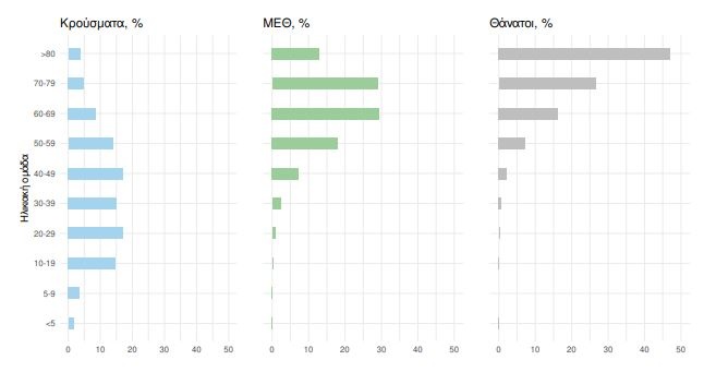 Ακολούθως παρουσιάζεται η ηλικιακή κατανομή των (α) συνολικών κρουσμάτων, (β) των περιστατικών που κατέληξαν σε θάνατο και (γ) των ασθενών που νοσηλεύονται διασωληνωμένοι: