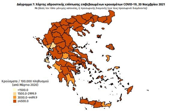 Πίνακας: Ημερήσιος αριθμός και κρούσματα ανά 100.000 πληθυσμού επιβεβαιωμένων εγχώριων κρουσμάτων COVID-19 ανά περιφερειακή ενότητα στις 20 Νοεμβρίου 2021