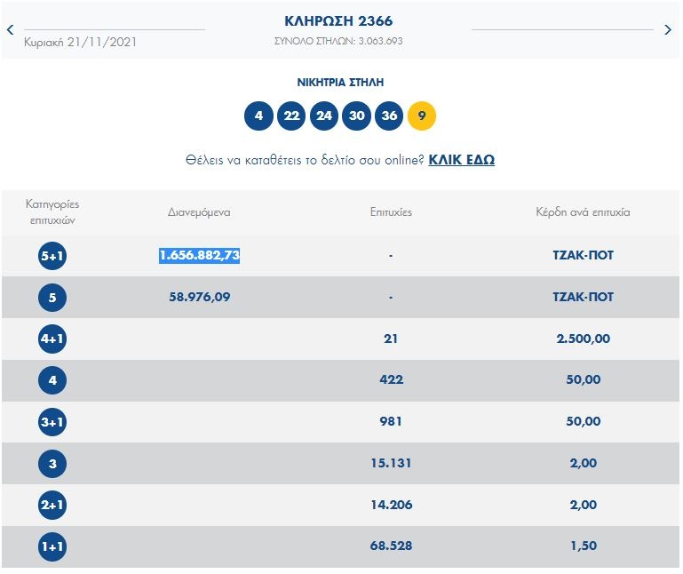 ΥΠενθυμίζεται ότι οι τυχεροί αριθμοί που έβγαλε η κληρωτίδα της περασμένης κλήρωσης ήταν οι: 4, 22, 24, 30, 36 και Tζόκερ ο αριθμός 9.