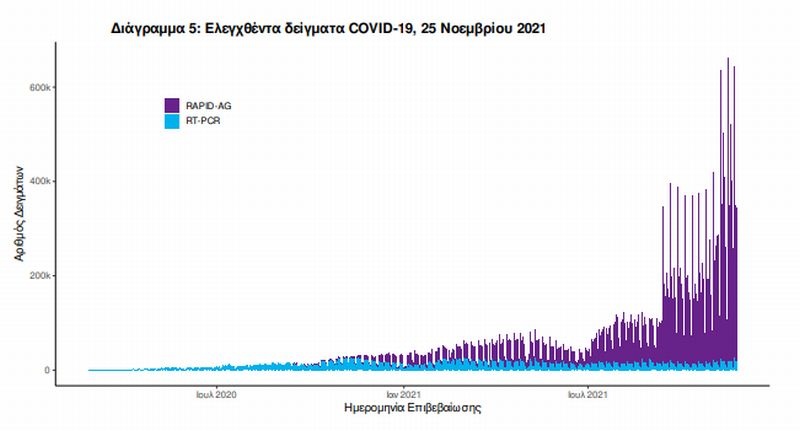 Από την 1η Ιανουαρίου 2020 μέχρι σήμερα, στα εργαστήρια που διενεργούν ελέγχους για τον νέο κορονοϊό (SARS-CoV-2) και που δηλώνουν συστηματικά το σύνολο των δειγμάτων που ελέγχουν, έχουν συνολικά ελεγχθεί 7.409.870 κλινικά δείγματα ενώ από Μονάδες Υγείας και Κλιμάκια του ΕΟΔΥ που διενεργούν ελέγχους Rapid Ag έχουν ελεγχθεί 27.063.891 δείγματα. O μέσος όρος του επταημέρου είναι 375.249 δειγματοληπτικοί έλεγχοι.
