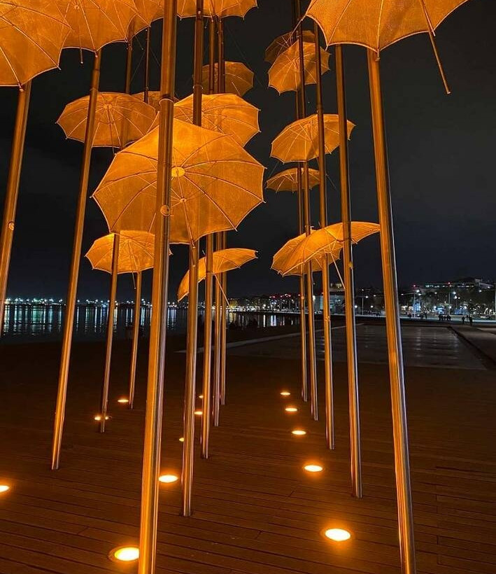Με πορτοκαλί χρώμα φωτίστηκαν οι «Ομπρέλες» του Ζογγολόπουλου, στη νέα παραλία Θεσσαλονίκης, με αφορμή την Παγκόσμια Ημέρα Εξάλειψης της Βίας κατά των Γυναικών.
