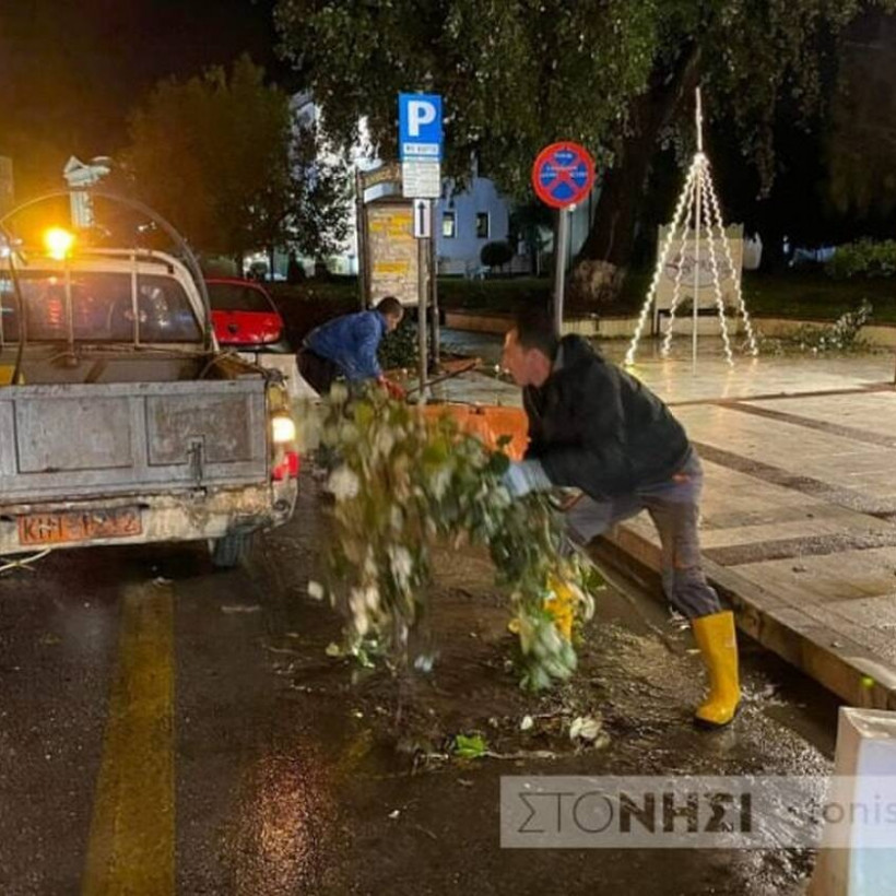 Συνεργεία των Δήμων του νησιού εργάζονται για να αποκαταστήσουν τις όποιες ζημιές έχουν προκληθεί και ιδιαίτερα να καθαρίσουν φρεάτια από φερτά υλικά.