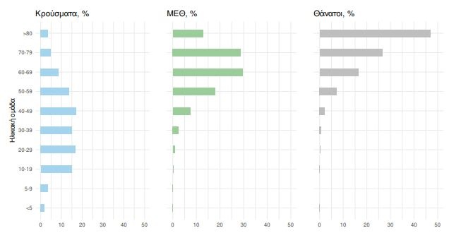 Ακολούθως παρουσιάζεται η ηλικιακή κατανομή των (α) συνολικών κρουσμάτων, (β) των περιστατικών που κατέληξαν σε θάνατο και (γ) των ασθενών που νοσηλεύονται διασωληνωμένοι:
