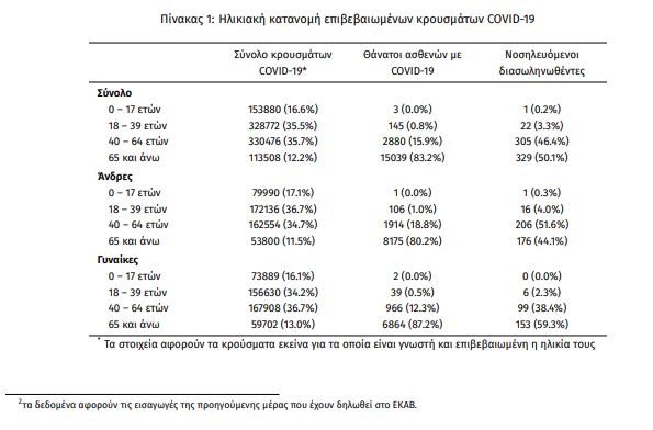 Οι νέοι θάνατοι ασθενών με Covid-19 είναι 104, ενώ από την έναρξη της επιδημίας έχουν καταγραφεί συνολικά 18.067 θάνατοι. Το 95,4% είχε υποκείμενο νόσημα ή/και ηλικία 70 ετών και άνω.