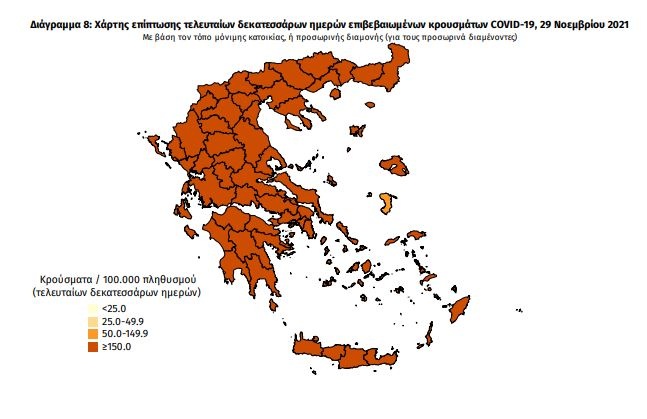 Γεωγραφική διασπορά: Ο χάρτης αποτυπώνει τη γεωγραφική κατανομή των συνολικών κρουσμάτων COVID-19 (από την αρχή της επιδημίας) ανά Περιφερειακή Ενότητα της χώρας, με βάση την δηλωθείσα διεύθυνση μόνιμης κατοικίας του ασθενούς, ή τη διεύθυνση προσωρινής διαμονής για τους τουρίστες και άλλους προσωρινά διαμένοντες στην Ελλάδα. Συμπεριλαμβάνονται τόσο κρούσματα με ιστορικό ταξιδιού (“εισαγόμενα”) όσο και κρούσματα με πιθανή εγχώρια μετάδοση.