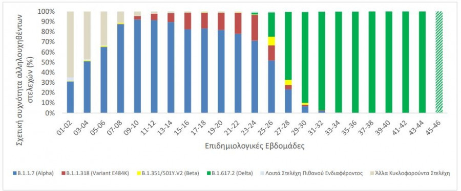 Μεταξύ των 32.809 τυχαία επιλεγμένων δειγμάτων στην επικράτεια, τα τέσσερα πιο συχνά στελέχη ειδικού ενδιαφέροντος ή υπό παρακολούθηση που έχουν απομονωθεί είναι το Alpha, με ποσοστό 47,44%, ακολουθούμενο από το Delta με ποσοστό 37,84%, το B.1.1.318 (Variant E484K) με ποσοστό 7,14%, και το Beta με ποσοστό 1,01% (Πίνακας 4). Η διαχρονική εξέλιξη της σχετικής συχνότητας των αλληλουχηθέντων δειγμάτων από τυχαία δειγματοληψία ανά είδος στελεχών, μέχρι και την εβδομάδα 44 απεικονίζεται στο Διάγραμμα 9, ενώ δίνονται επιπλέον προσωρινά στοιχεία για τις εβδομάδες 45-46.