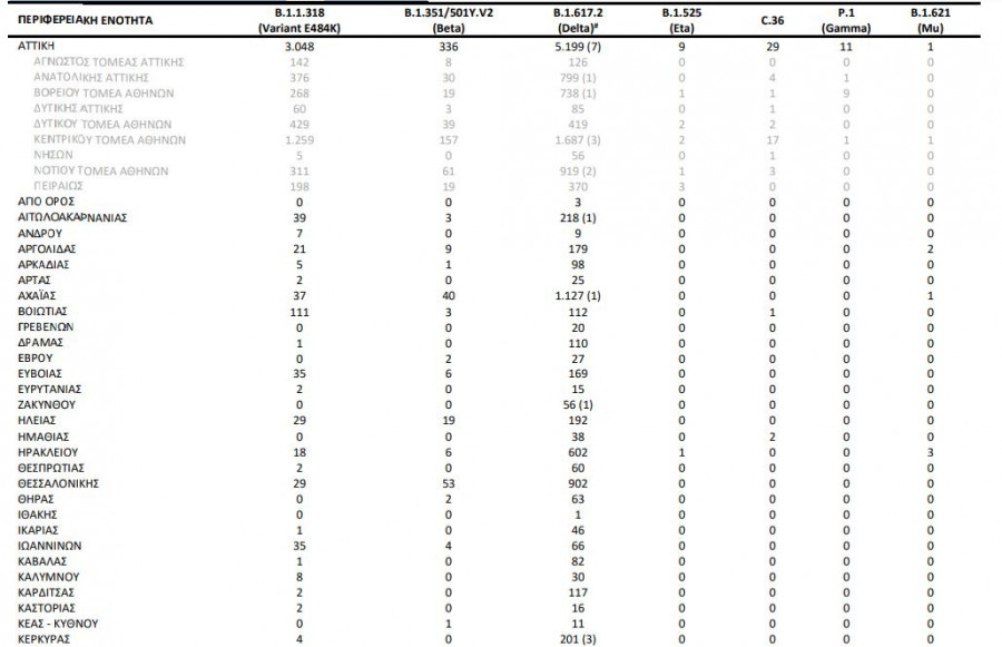 Εκ των 885 δειγμάτων με στελέχη ειδικού ενδιαφέροντος, όλα αφορούν στο στέλεχος Delta (Πίνακας 3). Επτά εκ των 885 στελεχών Delta αφορούν στο στέλεχος ΑΥ.4.2, τα οποία εντοπίστηκαν στις Περιφερειακές Ενότητες του Λασιθίου (5) της Αχαΐας (1) και της Αιτωλοακαρνανίας.