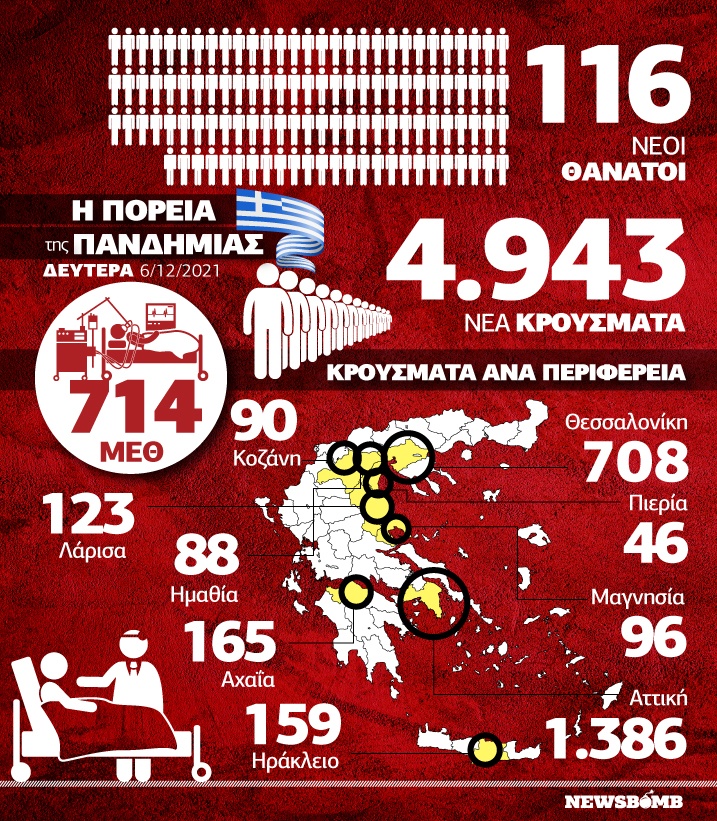 Κρούσματα σήμερα: 4.943 νέα ανακοίνωσε ο ΕΟΔΥ - 116 θάνατοι και 714 διασωληνωμένοι