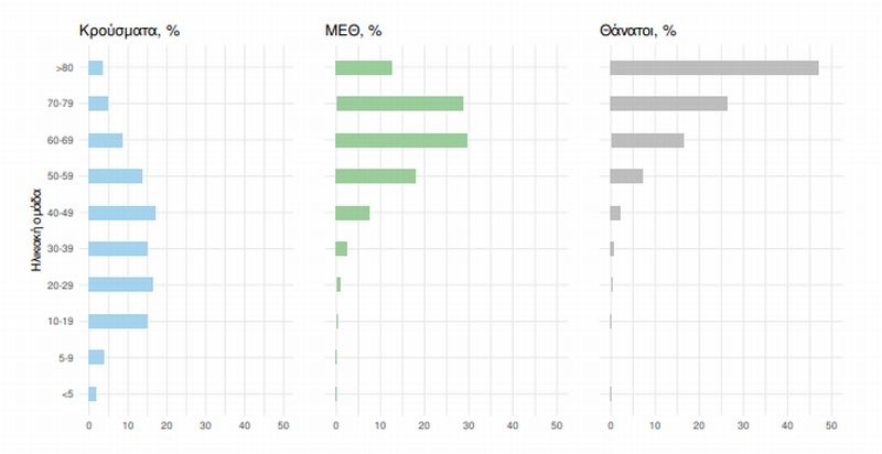 Οι εισαγωγές νέων ασθενών Covid-19 στα νοσοκομεία της επικράτειας είναι 405 (ημερήσια μεταβολή +6.58%). Ο μέσος όρος εισαγωγών του επταημέρου είναι 436 ασθενείς.Η διάμεση ηλικία των κρουσμάτων είναι 38 έτη (εύρος 0.2 έως 106 έτη), ενώ η διάμεση ηλικία των θανόντων είναι 78 έτη (εύρος 0.2 έως 106 έτη).