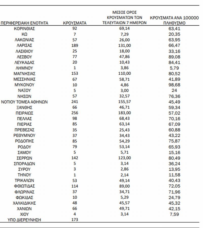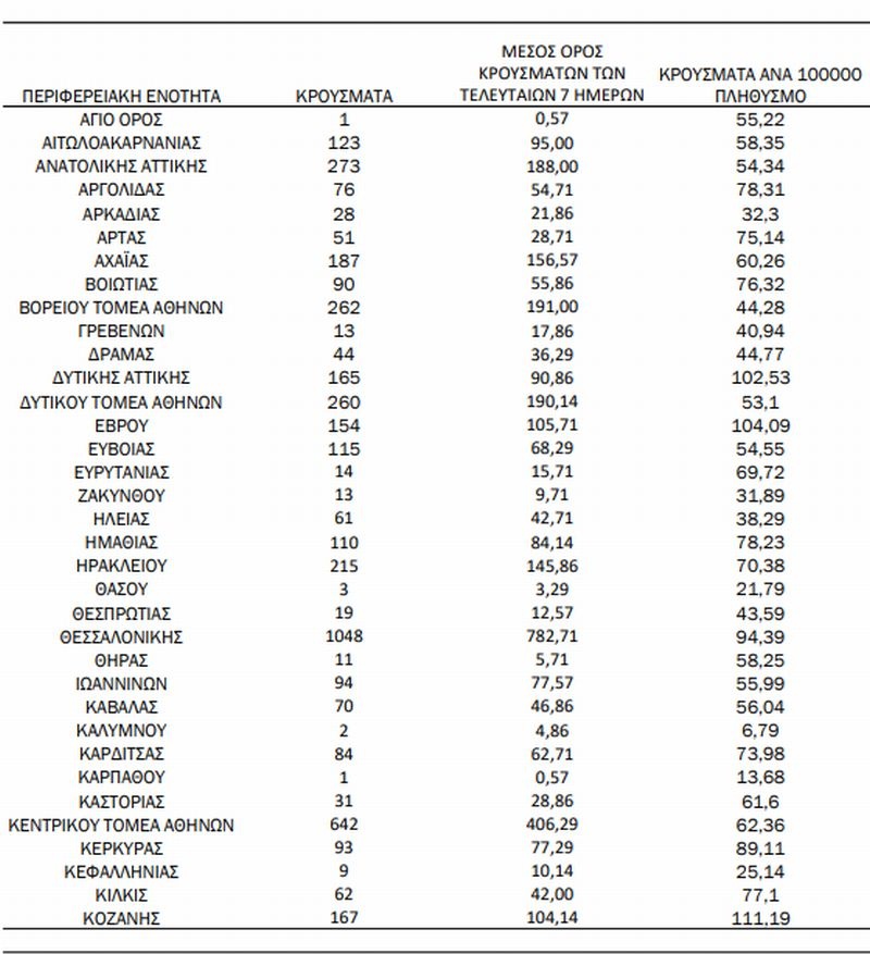 Η κατανομή των 6.994 νέων εγχώριων κρουσμάτων ανά Περιφερειακή Ενότητα παρουσιάζεται στον κατωτέρω πίνακα