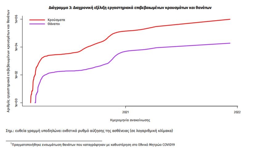 Η διαχρονική εξέλιξη των συνολικών κρουσμάτων και συνολικού αριθμού των θανάτων ασθενών COVID-19 παρουσιάζεται στο ακόλουθο διάγραμμα.
