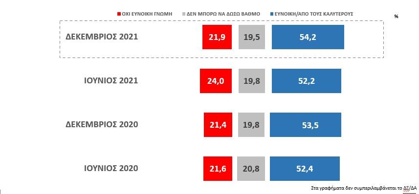 Τα αποτελέσματα παρουσιάζονται σε επίπεδο συνολικού δείγματος. Τα διαχρονικά στοιχεία, οι αναλύσεις σε σημαντικά υποκοινά (πχ δημογραφικά στοιχεία, ψηφοφόροι κομμάτων κλπ) και συγκεκριμένες ερωτήσεις συμπεριλαμβάνονται στην πλήρη έκθεση της έρευνας/μελέτη.