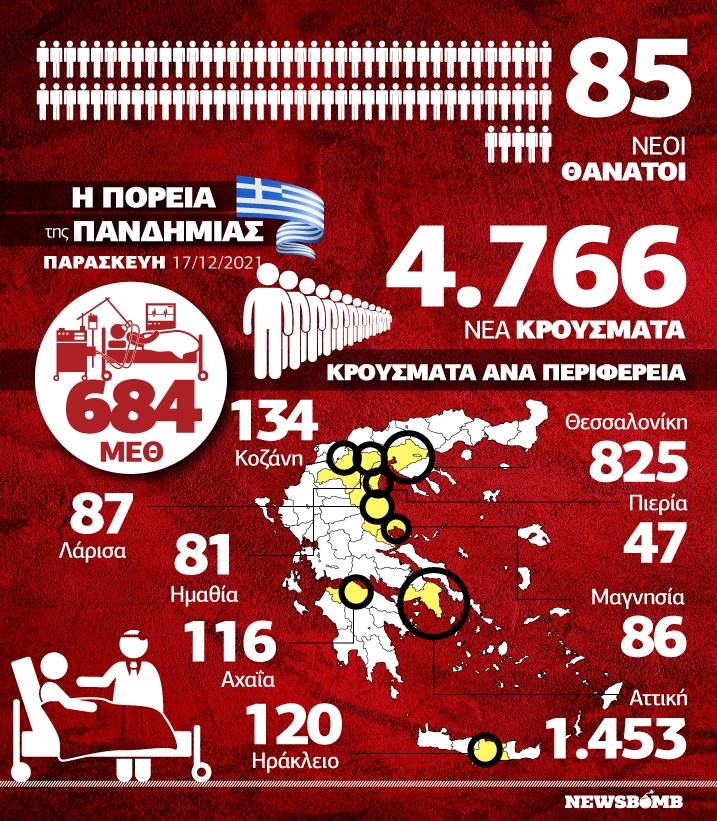 Ο ΕΟΔΥ ανακοίνωσε 4.766 νέα κρούσματα, εκ των οποίων 16 εντοπίστηκαν κατόπιν ελέγχων στις πύλες εισόδου της χώρας.