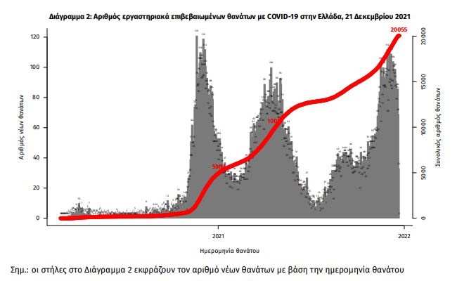 Η διαχρονική εξέλιξη των συνολικών κρουσμάτων και συνολικού αριθμού των θανάτων ασθενών COVID-19 παρουσιάζεται στο ακόλουθο διάγραμμα.