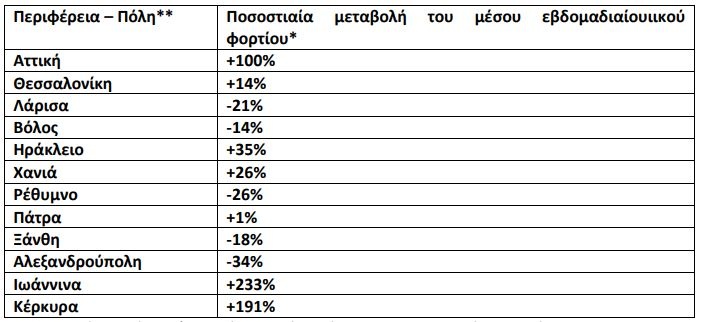 Ποσοστιαία μεταβολή στη μέση συγκέντρωση του ιικού φορτίου του SARS-CoV-2 στα αστικά λύματα ανά 100.000 κατοίκους την εβδομάδα 20–26/12/2021 σε σχέση με την εβδομάδα 13–19/12/2021.