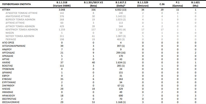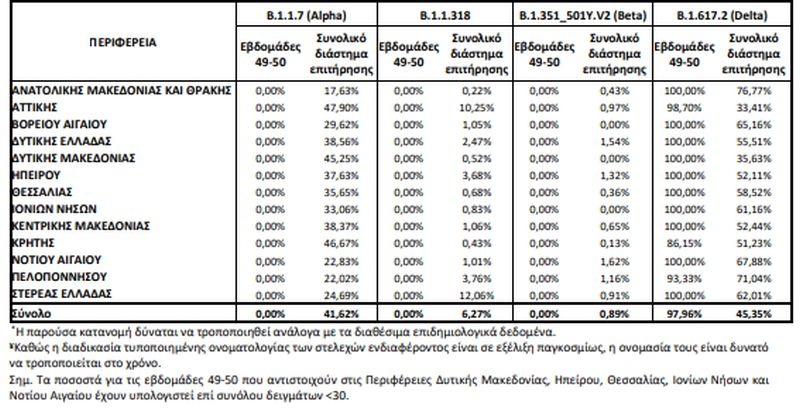 Ολοκληρώθηκε από το Eθνικό Δίκτυο Γονιδιωματικής Επιτήρησης του ιού SARS-CoV-2, που λειτουργεί υπό τον συντονισμό του ΕΟΔΥ, η γονιδιωματική ανάλυση σε 1.301 δείγματα που έχουν επιλεγεί τυχαιοποιημένα ή στοχευμένα και αφορούν στην περίοδο 29 Νοεμβρίου 2021 έως 20 Δεκεμβρίου 2021. Από τον έλεγχο των 1.301 δειγμάτων, αναδείχθηκαν συνολικά 1.265 δείγματα με στελέχη ειδικού ενδιαφέροντος (Variants Of Concern - VOC). Εκ των 1.265 δειγμάτων με στελέχη ειδικού ενδιαφέροντος, τα 1.204 αφορούν στο στέλεχος Delta και 61 αφορούν στο Omicron.