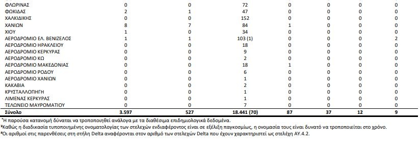 Από τα 3.565 δείγματα που έχουν ληφθεί ή επιλεγεί στοχευμένα, έχουν βρεθεί 3.402 στελέχη ειδικού ενδιαφέροντος ή υπό παρακολούθηση ή ενδιαφέροντος. Από τα δείγματα που έχουν ληφθεί ή επιλεγεί στοχευμένα, 36,94% αφορούν στο Delta, 36,75% στο B.1.1.318 (Variant E484K), 15,12% στο Alpha, 5,67% στο Beta, 0,56% στο Omicron, 0,11% στο C.36, 0,08% στο Eta, 0,08% στο Gamma, 0,08% στο A.28 και 0,03% στο Mu. Επιπλέον, έχουν απομονωθεί συνολικά 475 στελέχη ειδικού ενδιαφέροντος ή υπό παρακολούθηση ή ενδιαφέροντος από δείγματα εισαγόμενων κρουσμάτων, εκ των οποίων 310 αφορούν στο Delta, 113 στο Alpha, 31 στο Omicron, 7 στο Mu, 6 στο Beta, 4 στο B.1.1.318 (Variant E484K), 1 στο Eta, 1 στο C.36, 1 στο Kappa, 1 στο B.1.1 (Variant E484K).
