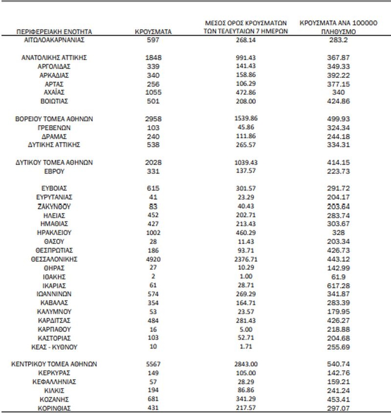 Η κατανομή των 40.527 νέων εγχώριων κρουσμάτων ανά Περιφερειακή Ενότητα παρουσιάζεται στον κατωτέρω πίνακα.