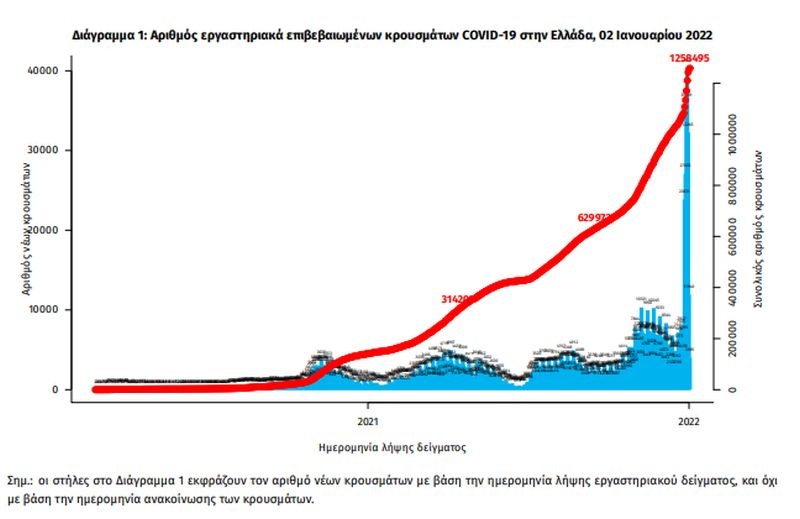 Η ημερήσια κατανομή των επιβεβαιωμένων κρουσμάτων είναι η ακόλουθη (η γραμμή παριστάνει την συνολική, αθροιστική κατανομή των κρουσμάτων.