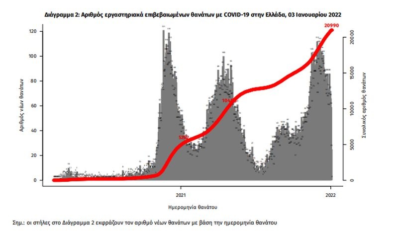 Οι νέοι θάνατοι ασθενών με COVID-19 είναι 78, ενώ από την έναρξη της επιδημίας έχουν καταγραφεί συνολικά 20.990 θάνατοι. Το 95.1% είχε υποκείμενο νόσημα ή/και ηλικία 70 ετών και άνω.