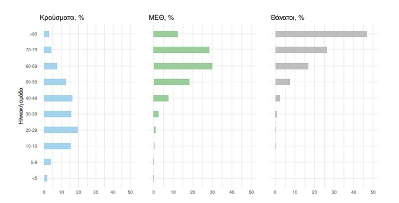 Οι εισαγωγές νέων ασθενών Covid-19 στα νοσοκομεία της επικράτειας είναι 641 (ημερήσια μεταβολή +41.81%). Ο μέσος όρος εισαγωγών του επταημέρου είναι 462 ασθενείς.Η διάμεση ηλικία των κρουσμάτων είναι 36 έτη (εύρος 0.2 έως 106 έτη), ενώ η διάμεση ηλικία των θανόντων είναι 78 έτη (εύρος 0.2 έως 106 έτη).