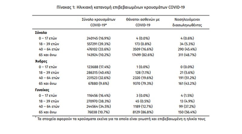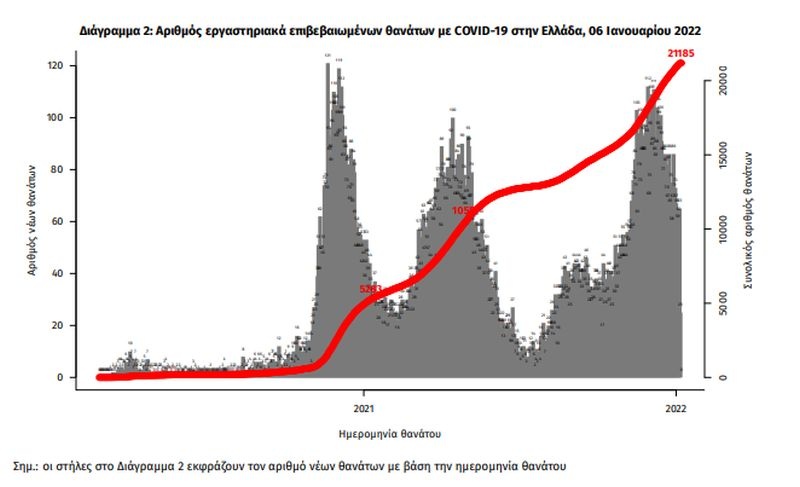 Οι νέοι θάνατοι ασθενών με COVID-19 είναι 70, ενώ από την έναρξη της επιδημίας έχουν καταγραφεί συνολικά 21.185 θάνατοι. Το 95.1% είχε υποκείμενο νόσημα ή/και ηλικία 70 ετών και άνω.