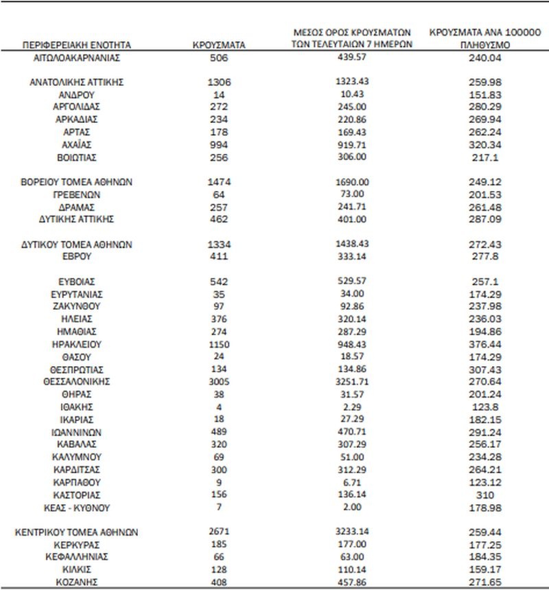 Η κατανομή των 29.230 νέων εγχώριων κρουσμάτων ανά Περιφερειακή Ενότητα παρουσιάζεται στον κατωτέρω πίνακα.