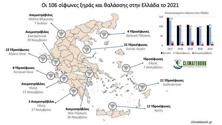 Στην Ελλάδα το 2021 καταγράφηκαν 97 υδροσίφωνες (σίφωνες θαλάσσης) και εννέα ανεμοστρόβιλοι (σίφωνες ξηράς), οι οποίοι προκάλεσαν υλικές ζημιές.