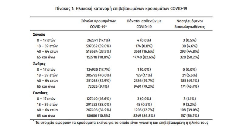 Οι νέοι θάνατοι ασθενών με COVID-19 είναι 85, ενώ από την έναρξη της επιδημίας έχουν καταγραφεί συνολικά 21.479 θάνατοι. Το 95.1% είχε υποκείμενο νόσημα ή/και ηλικία 70 ετών και άνω.