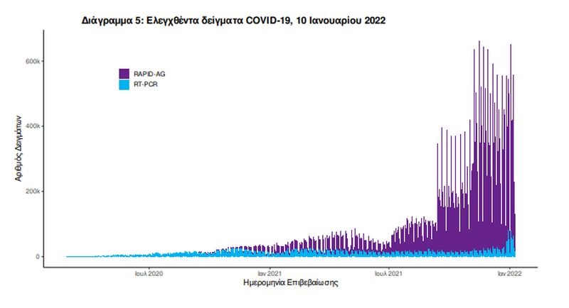 Από την 1η Ιανουαρίου 2020 μέχρι σήμερα, στα εργαστήρια που διενεργούν ελέγχους για τον νέο κορονοϊό (SARS-CoV-2) και που δηλώνουν συστηματικά το σύνολο των δειγμάτων που ελέγχουν, έχουν συνολικά ελεγχθεί 8.681.368 κλινικά δείγματα ενώ από Μονάδες Υγείας και Κλιμάκια του ΕΟΔΥ που διενεργούν ελέγχους Rapid Ag έχουν ελεγχθεί 41.835.474 δείγματα. O μέσος όρος του επταημέρου είναι 363.031 δειγματοληπτικοί έλεγχοι.