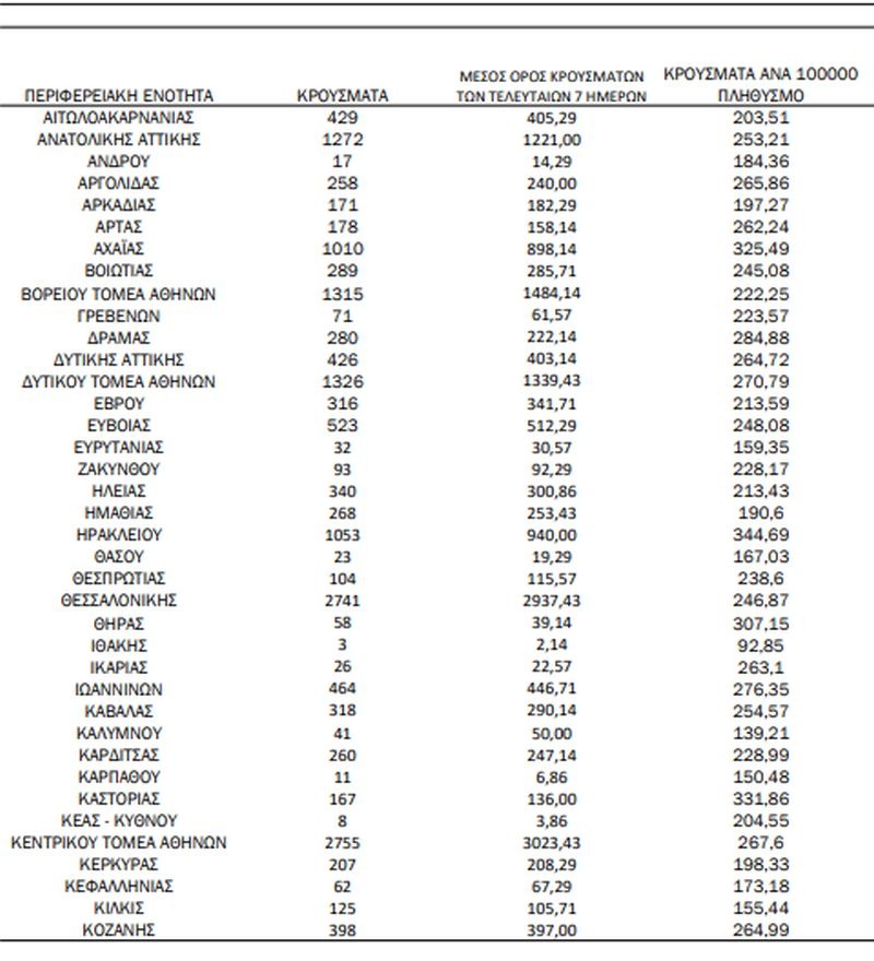 Η κατανομή των 27.661 νέων εγχώριων κρουσμάτων ανά Περιφερειακή Ενότητα παρουσιάζεται στον κατωτέρω πίνακα.
