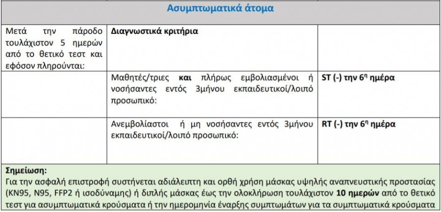 - Επιστροφή στο σχολείο με αρνητικό αποτέλεσμα σε ST οι μαθητές/τριες και RT ή PCR οι εκπαιδευτικοί/λοιπό προσωπικό που διενεργείται την 5η ημέρα