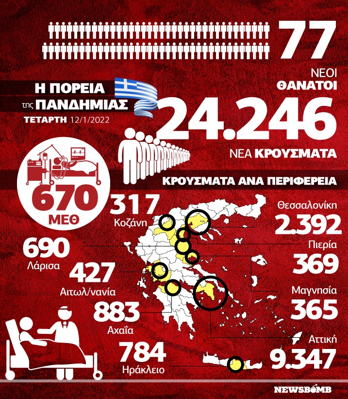 Πιο συγκεκριμένα, ο ΕΟΔΥ ανακοίνωσε σήμερα 24.246 νέα κρούσματα. Οι νέοι θάνατοι ασθενών με COVID-19 είναι 77, ενώ από την έναρξη της επιδημίας έχουν καταγραφεί συνολικά 21.637 θάνατοι. Το 95.1% είχε υποκείμενο νόσημα ή/και ηλικία 70 ετών και άνω.