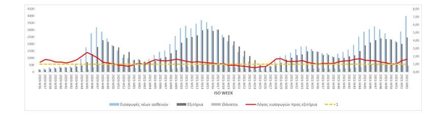 Την εβδομάδα αναφοράς, οι εισαγωγές νέων ασθενών ήταν 3.988, ενώ το σύνολο των εξιτηρίων λόγω ίασης ήταν 2.467. O λόγος εισαγωγών νέων ασθενών προς εξιτήρια λόγω ίασης ήταν 1.62.