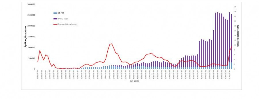 Ειδικότερα, σύμφωνα με τον ΕΟΔΥ, την εβδομάδα αναφοράς, το ποσοστό θετικότητας ήταν 9.43% σε σύνολο 2.541.216 εργαστηριακών ελέγχων (RT-PCR/Rapid-Ag) και 2.70% σε σύνολο 1.643.264 αυτοδιαγνωστικών ελέγχων. Στο σύνολο των ελέγχων, το ποσοστό θετικότητας ήταν 5.67%.