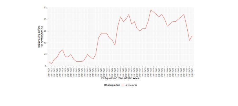 Την εβδομάδα αναφοράς, το σύνολο των ασθενών ηλικίας 4-18 ετών είναι 43.386, αποτελώντας το 18% (12% από την προηγούμενη εβδομάδα) στο σύνολο των κρουσμάτων.