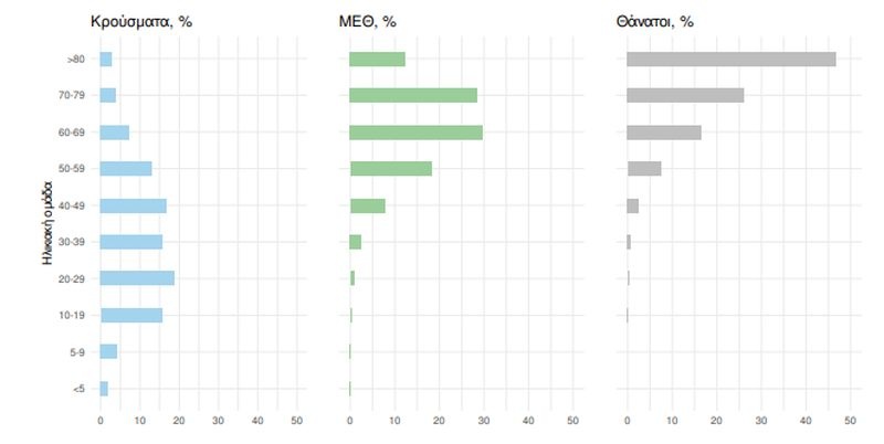 Οι εισαγωγές νέων ασθενών Covid-19 στα νοσοκομεία της επικράτειας είναι 563 (ημερήσια μεταβολή +2.18%). Ο μέσος όρος εισαγωγών του επταημέρου είναι 564 ασθενείς.Η διάμεση ηλικία των κρουσμάτων είναι 36 έτη (εύρος 0.2 έως 106 έτη), ενώ η διάμεση ηλικία των θανόντων είναι 78 έτη (εύρος 0.2 έως 106 έτη).