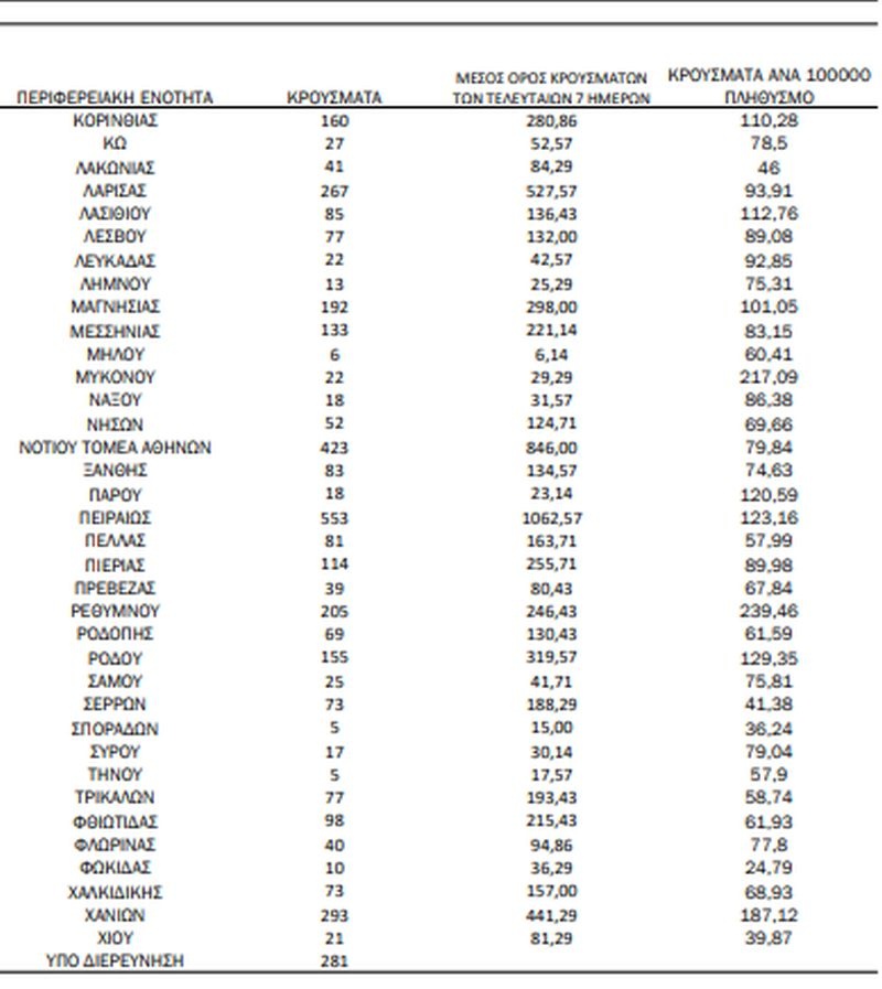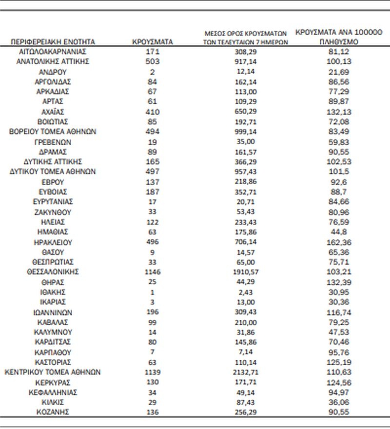 Η κατανομή των 10.719 νέων εγχώριων κρουσμάτων ανά Περιφερειακή Ενότητα παρουσιάζεται στον κατωτέρω πίνακα.