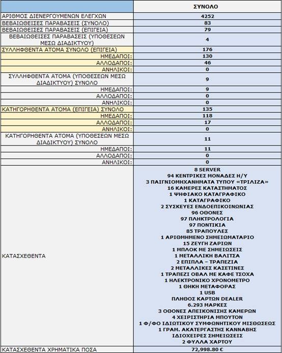 Από τις έρευνες που πραγματοποιήθηκαν, κατασχέθηκαν, μεταξύ άλλων, 122 συσκευές (ηλεκτρονικοί υπολογιστές, server, παιγνιομηχανήματα, κάμερες, καταγραφικό), 290 περιφερειακά ηλεκτρονικών υπολογιστών (πληκτρολόγια, οθόνες, ποντίκια) και 72.998,80 ευρώ.