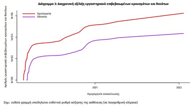 Η διαχρονική εξέλιξη των συνολικών κρουσμάτων και συνολικού αριθμού των θανάτων ασθενών COVID-19 παρουσιάζεται στο ακόλουθο διάγραμμα.