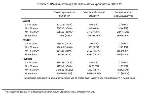 Οι νέοι θάνατοι ασθενών με COVID-19 είναι 81, ενώ από την έναρξη της επιδημίας έχουν καταγραφεί συνολικά 22.366 θάνατοι. Το 95.0% είχε υποκείμενο νόσημα ή/και ηλικία 70 ετών και άνω.